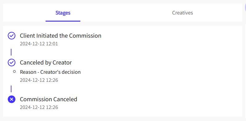 1. Once you accept a commission request, you can monitor its progress under the "Stages" tab.